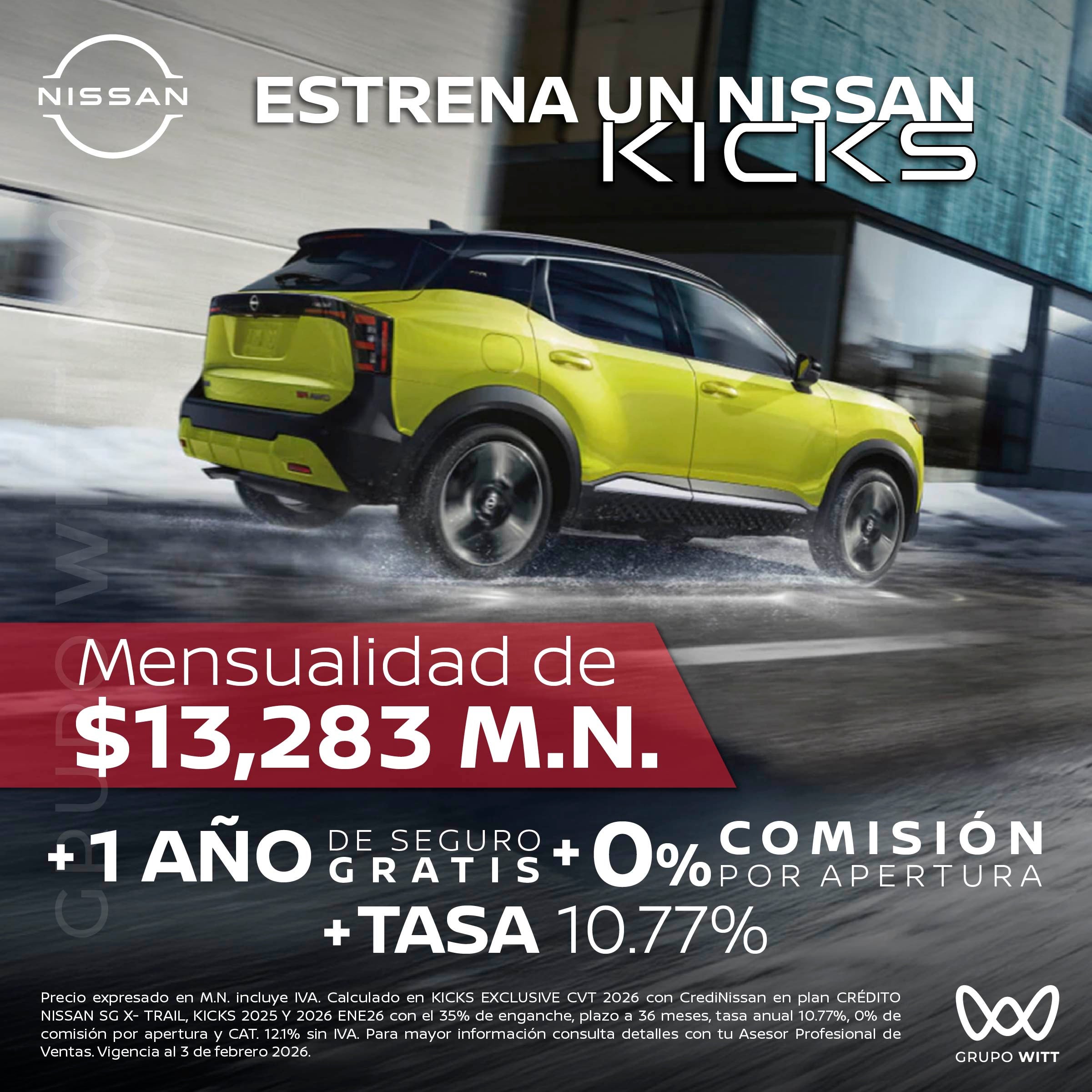 Precio expresado en M.N. incluye IVA. Calculado en KICKS EXCLUSIVE CVT 2026 con CrediNissan en plan CRÉDITO NISSAN SG X- TRAIL, KICKS 2025 Y 2026 ENE26 con el 35% de enganche, plazo a 36 meses, tasa anual 10.77%, 0% de comisión por apertura y CAT. 12.1% sin IVA. Para mayor información consulta detalles con tu Asesor Profesional de Ventas. Vigencia al 3 de febrero 2026.