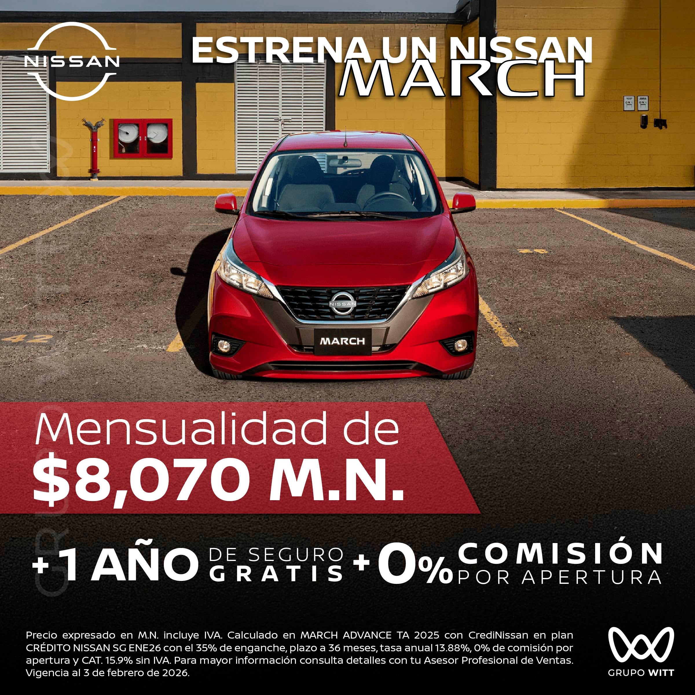Precio expresado en M.N. incluye IVA. Calculado en MARCH ADVANCE TA 2025 con CrediNissan en plan CRÉDITO NISSAN SG ENE26 con el 35% de enganche, plazo a 36 meses, tasa anual 13.88%, 0% de comisión por apertura y CAT. 15.9% sin IVA. Para mayor información consulta detalles con tu Asesor Profesional de Ventas. Vigencia al 3 de febrero de 2026.