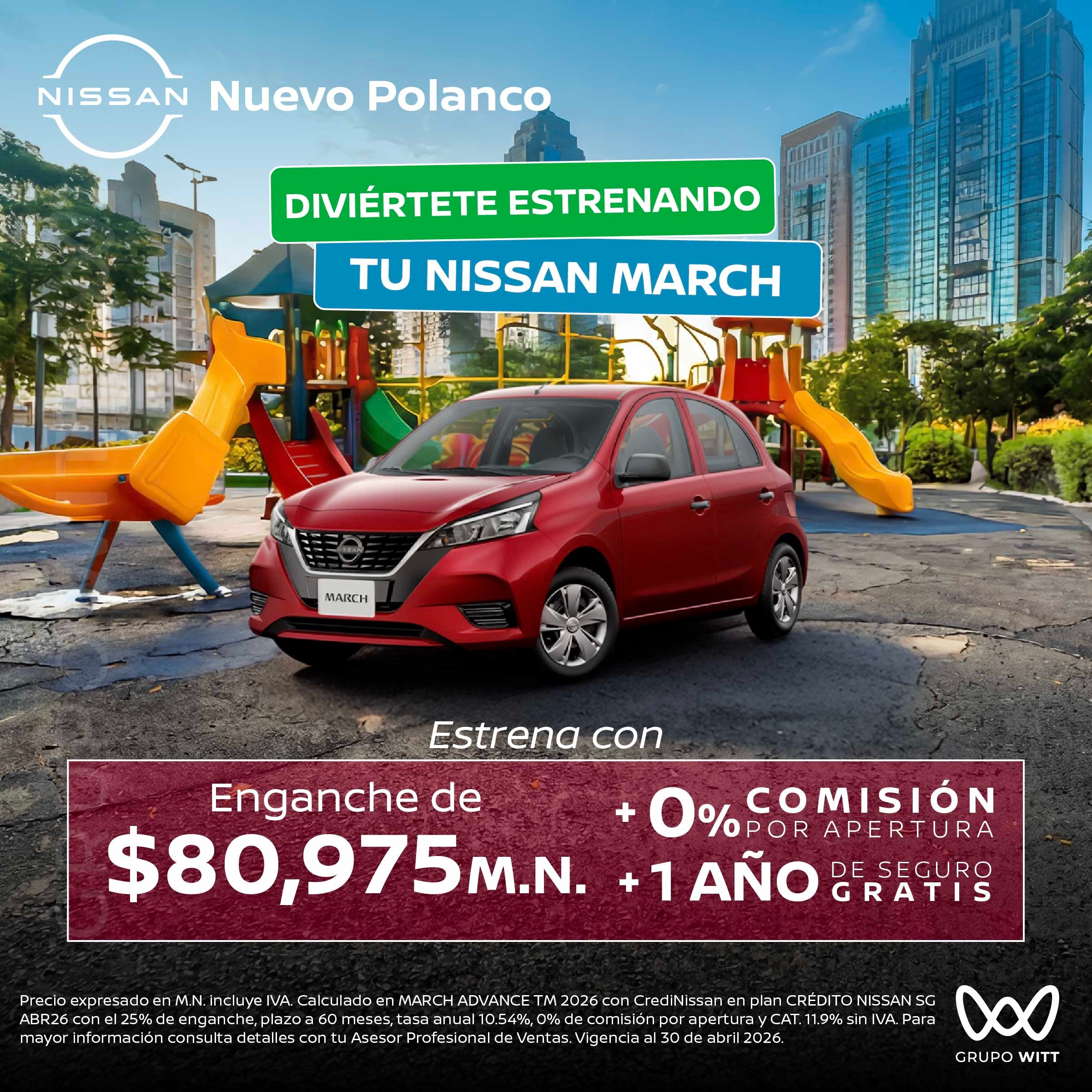 Precio expresado en M.N. incluye IVA. Calculado en MARCH ADVANCE TM 2026 con CrediNissan en plan CRÉDITO NISSAN SG ABR26 con el 25% de enganche, plazo a 60 meses, tasa anual 10.54%, 0% de comisión por apertura y CAT. 11.9% sin IVA. Para mayor información consulta detalles con tu Asesor Profesional de Ventas. Vigencia al 30 de abril 2026.