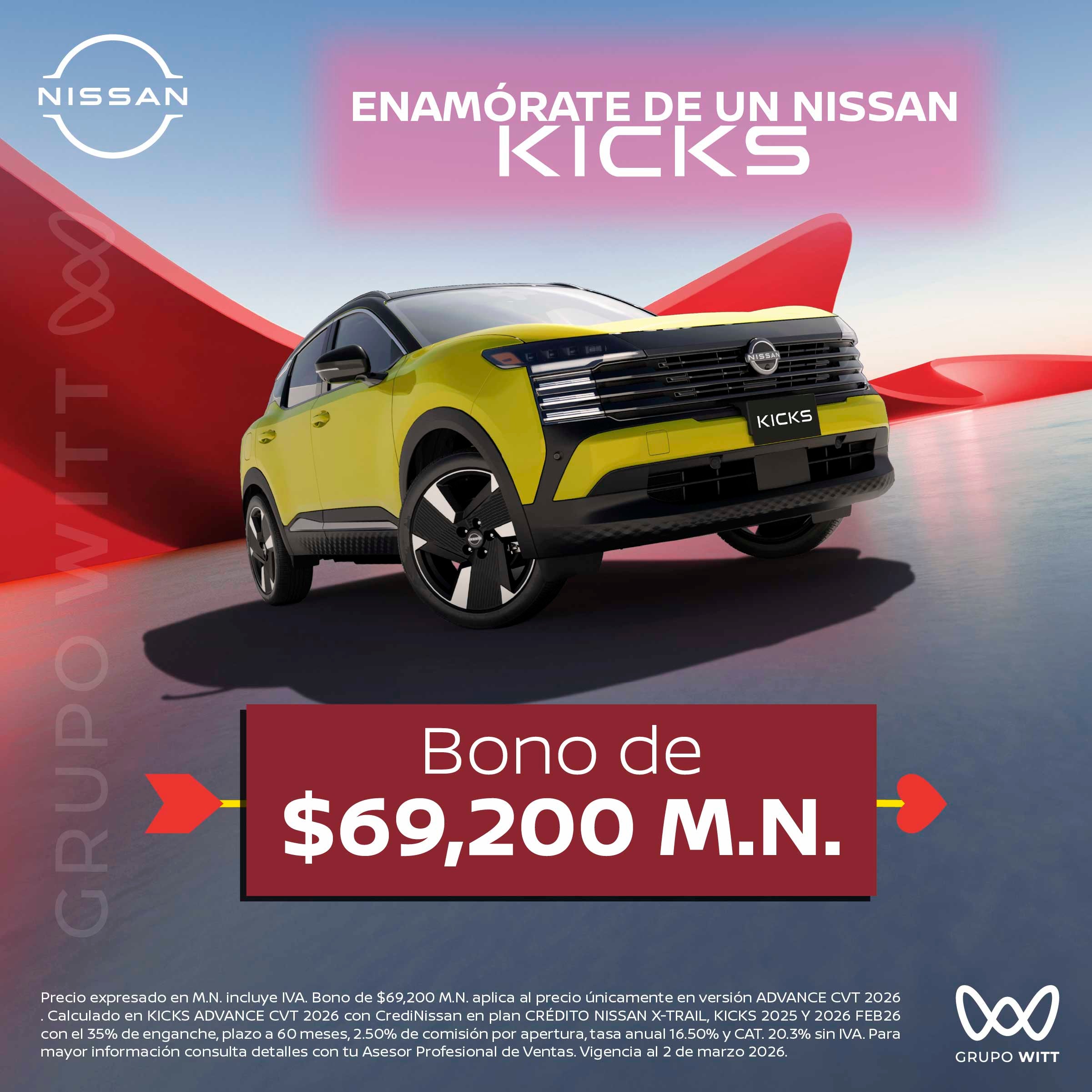 Precio expresado en M.N. incluye IVA. Bono de $69,200 M.N. aplica al precio únicamente en versión ADVANCE CVT 2026. Calculado en KICKS ADVANCE CVT 2026 con CrediNissan en plan CRÉDITO NISSAN X-TRAIL, KICKS 2025 Y 2026 FEB26 con el 35% de enganche, plazo a 60 meses, 2.50% de comisión por apertura, tasa anual 16.50% y CAT. 20.3% sin IVA. Para mayor información consulta detalles con tu Asesor Profesional de Ventas. Vigencia al 2 de marzo 2026.