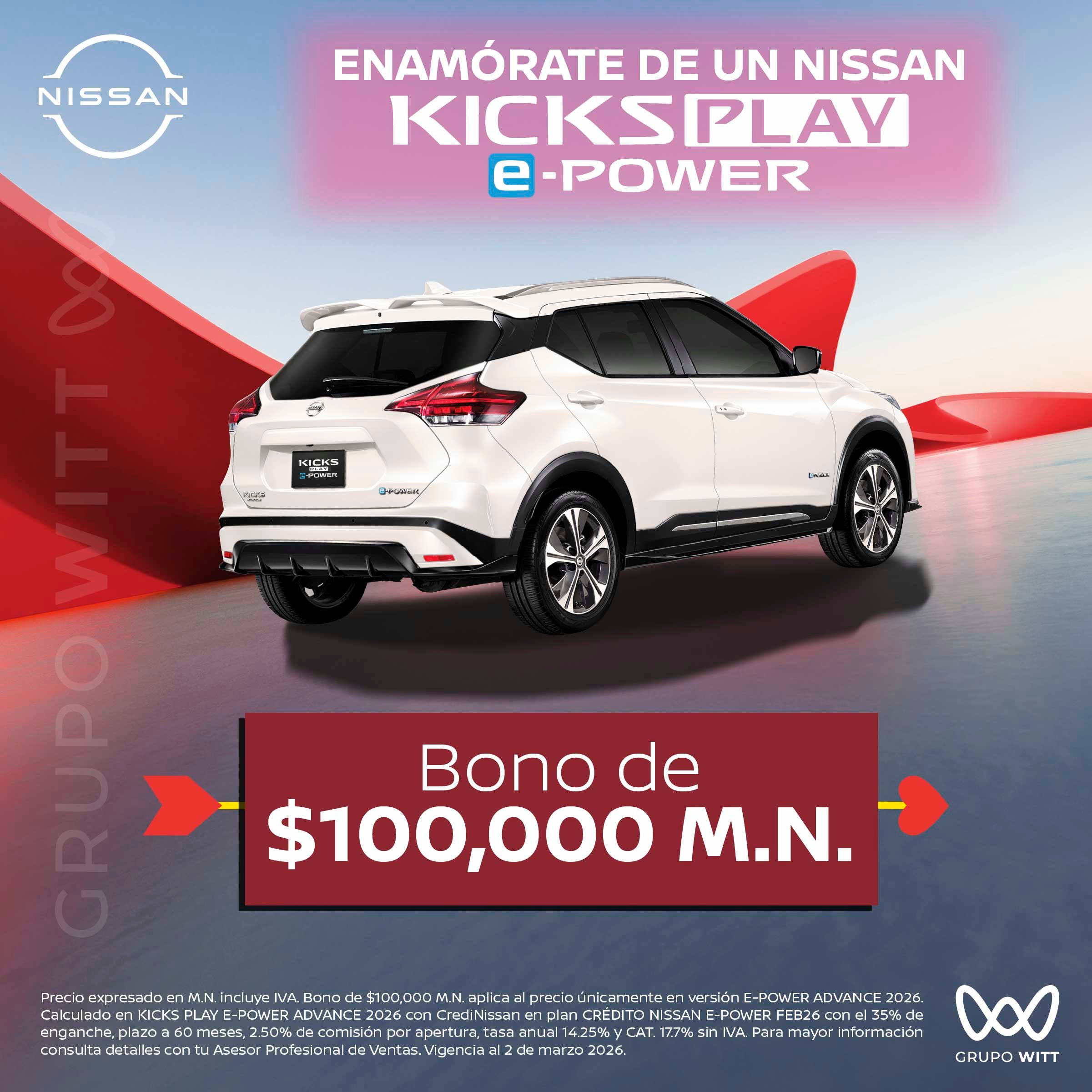 Precio expresado en M.N. incluye IVA. Bono de $100,000 M.N. aplica al precio únicamente en versión E-POWER ADVANCE 2026. Calculado en KICKS PLAY E-POWER ADVANCE 2026 con CrediNissan en plan CRÉDITO NISSAN E-POWER FEB26 con el 35% de enganche, plazo a 60 meses, 2.50% de comisión por apertura, tasa anual 14.25% y CAT. 17.7% sin IVA. Para mayor información consulta detalles con tu Asesor Profesional de Ventas. Vigencia al 2 de marzo 2026.
