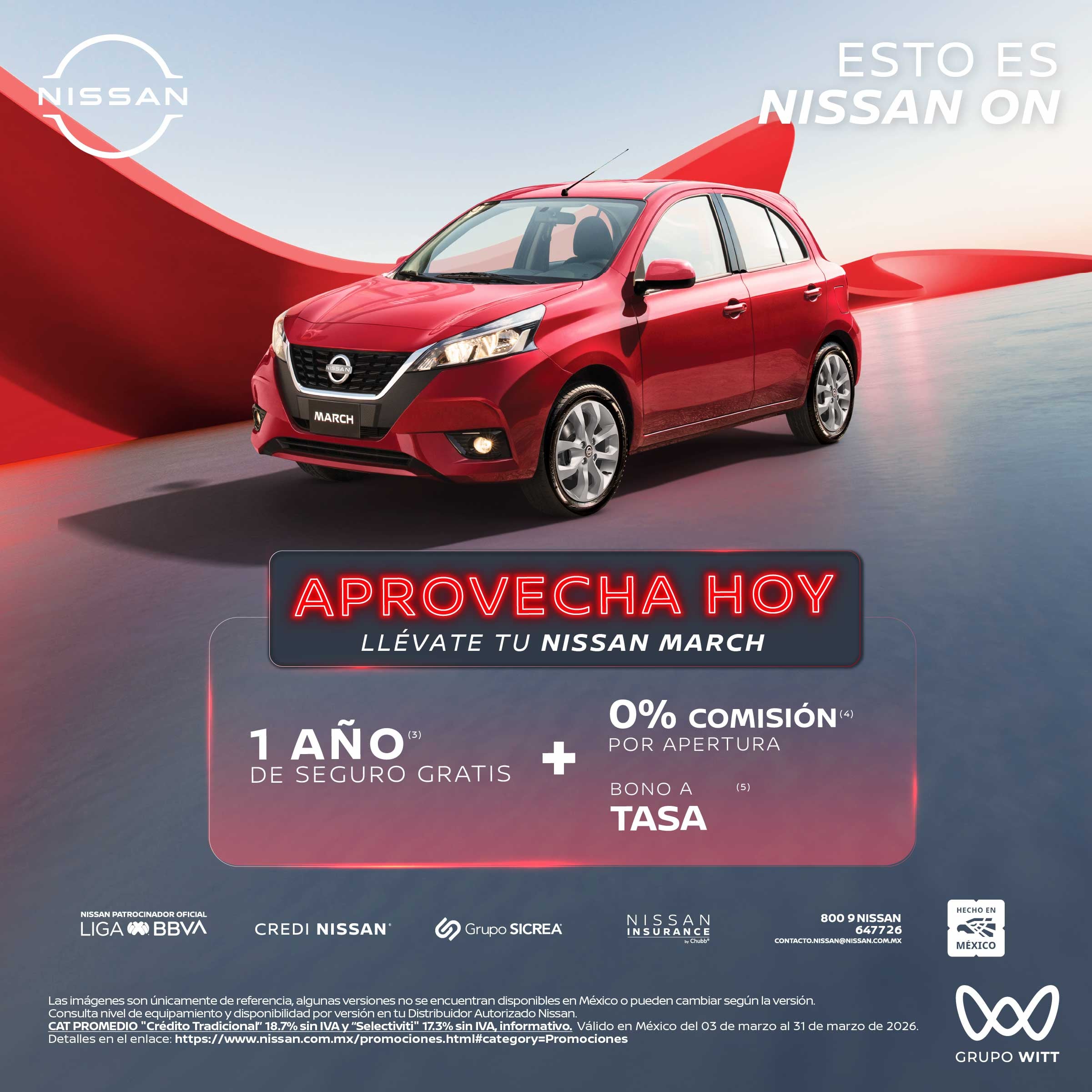 Las imágenes son únicamente de referencia, algunas versiones no se encuentran disponibles en México o pueden cambiar según la versión Consulta nivel de equipamiento y disponibilidad por versión en tu Distribuidor Autorizado Nissan. CAT PROMEDIO "Crédito Tradicional" 18.7% sin IVA y "Selectiviti" 17.3% sin IVA, informativo. Valido en México del 03 de marzo al 31 de marzo de 2026 Detalles en el enlace: https://www.nissan.com.mx/promociones.html#category=Promociones