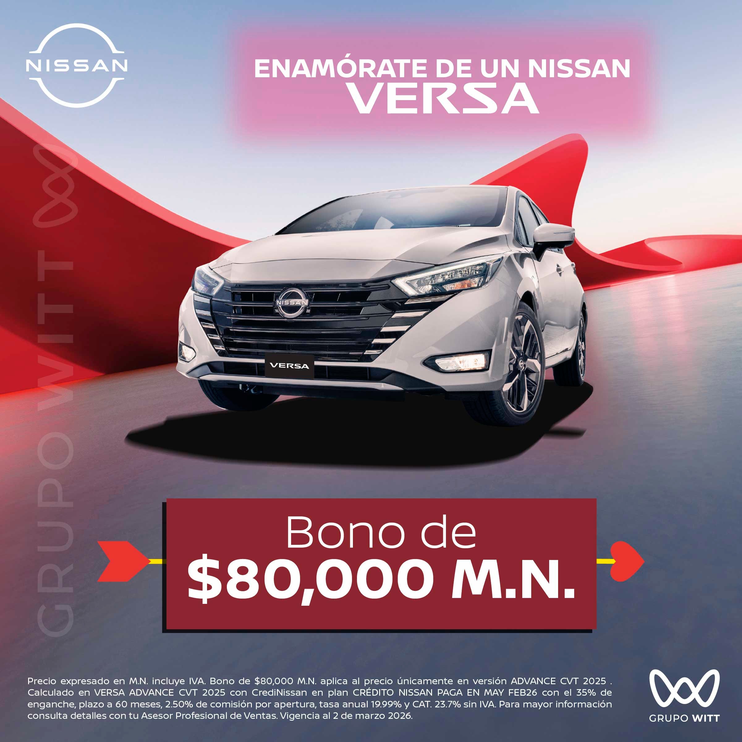 Precio expresado en M.N. incluye IVA. Bono de $80,000 M.N. aplica al precio únicamente en versión ADVANCE CVT 2025 Calculado en VERSA ADVANCE CVT 2025 con CrediNissan en plan CRÉDITO NISSAN PAGA EN MAY FEB26 con el 35% de enganche, plazo a 60 meses, 2.50% de comisión por apertura, tasa anual 19.99% y CAT. 23.7% sin IVA. Para mayor información consulta detalles con tu Asesor Profesional de Ventas. Vigencia al 2 de marzo 2026.
