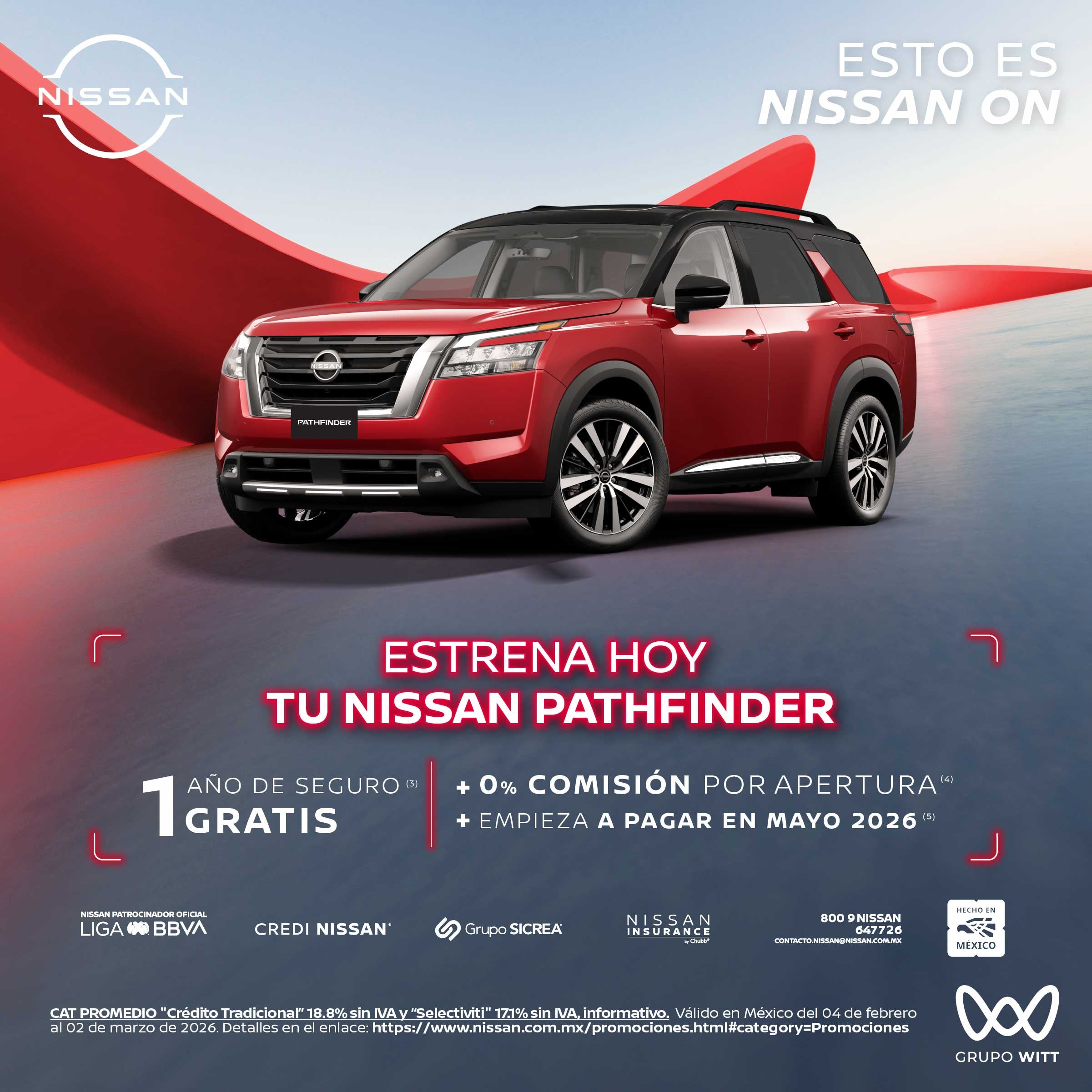 CAT PROMEDIO "Crédito Tradicional" 18.8% sin IVA y "Selectiviti" 17.1% sin IVA, informativo. Válido en México del 04 de febrero al 02 de marzo de 2026. Detalles en el enlace: https://www.nissan.com.mx/promociones.html#category=Promociones