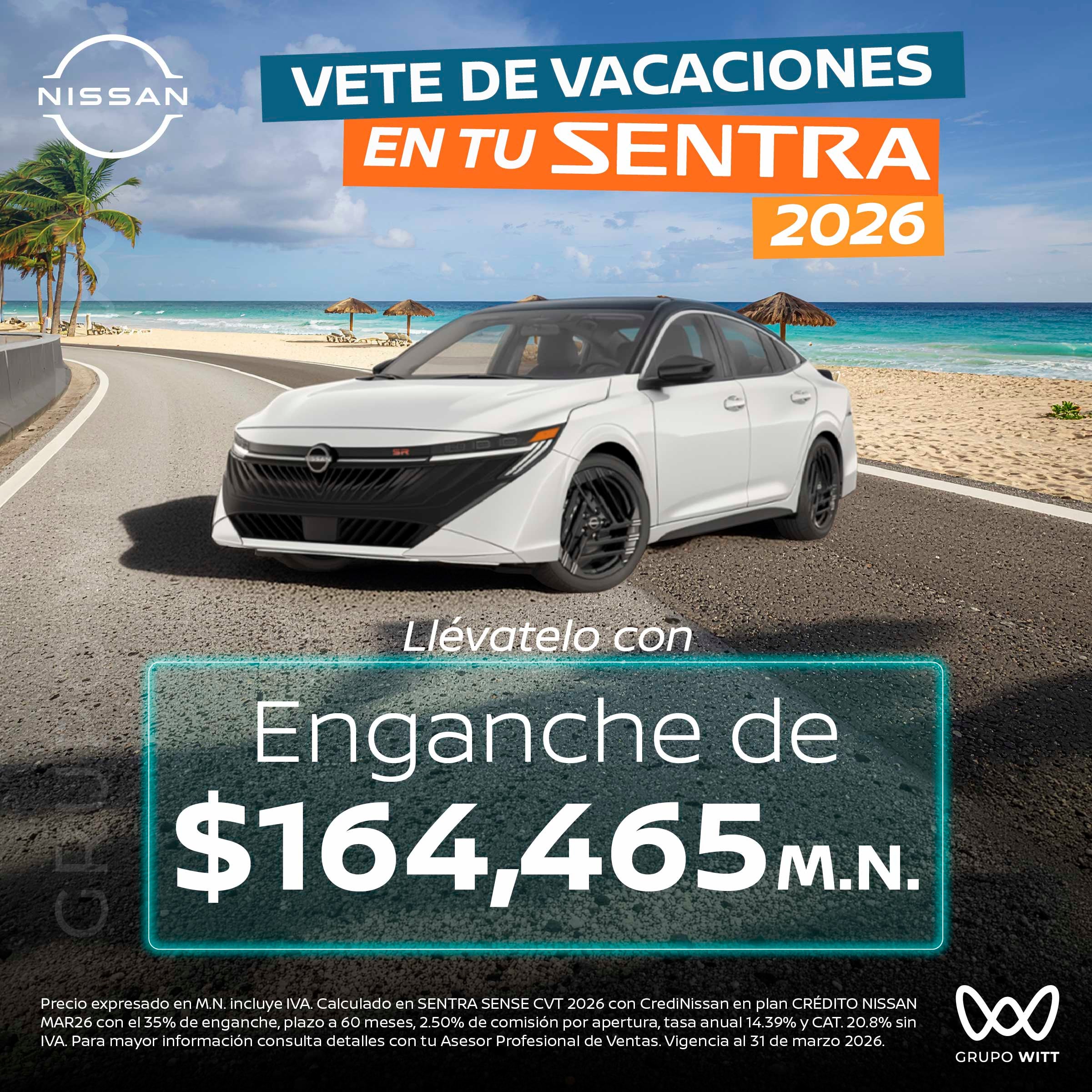 Precio expresado en M.N. incluye IVA. Calculado en SENTRA SENSE CVT 2026 con CrediNissan en plan CRÉDITO NISSAN MAR26 con el 35% de enganche, plazo a 60 meses, 2.50% de comisión por apertura, tasa anual 14.39% y CAT. 20.8% sin IVA. Para mayor información consulta detalles con tu Asesor Profesional de Ventas. Vigencia al 31 de marzo 2026.