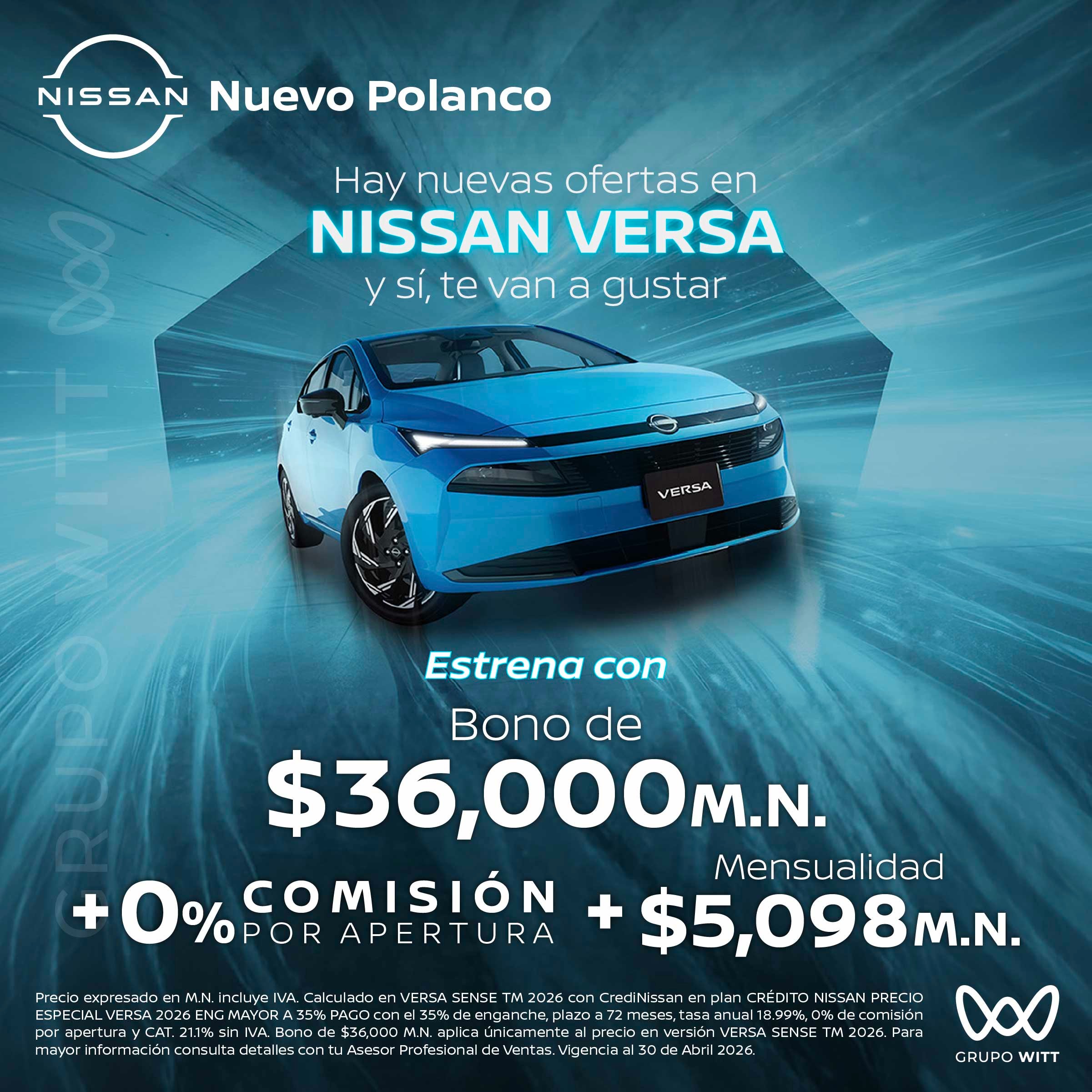 Precio expresado en M.N. incluye IVA. Calculado en VERSA SENSE TM 2026 con CrediNissan en plan CRÉDITO NISSAN PRECIO ESPECIAL VERSA 2026 ENG MAYOR A 35% PAGO con el 35% de enganche, plazo a 72 meses, tasa anual 18.99%, 0% de comisión por apertura y CAT. 21.1% sin IVA. Bono de $36,000 M.N. aplica únicamente al precio en versión VERSA SENSE TM 2026. Para mayor información consulta detalles con tu Asesor Profesional de Ventas. Vigencia al 30 de Abril 2026.