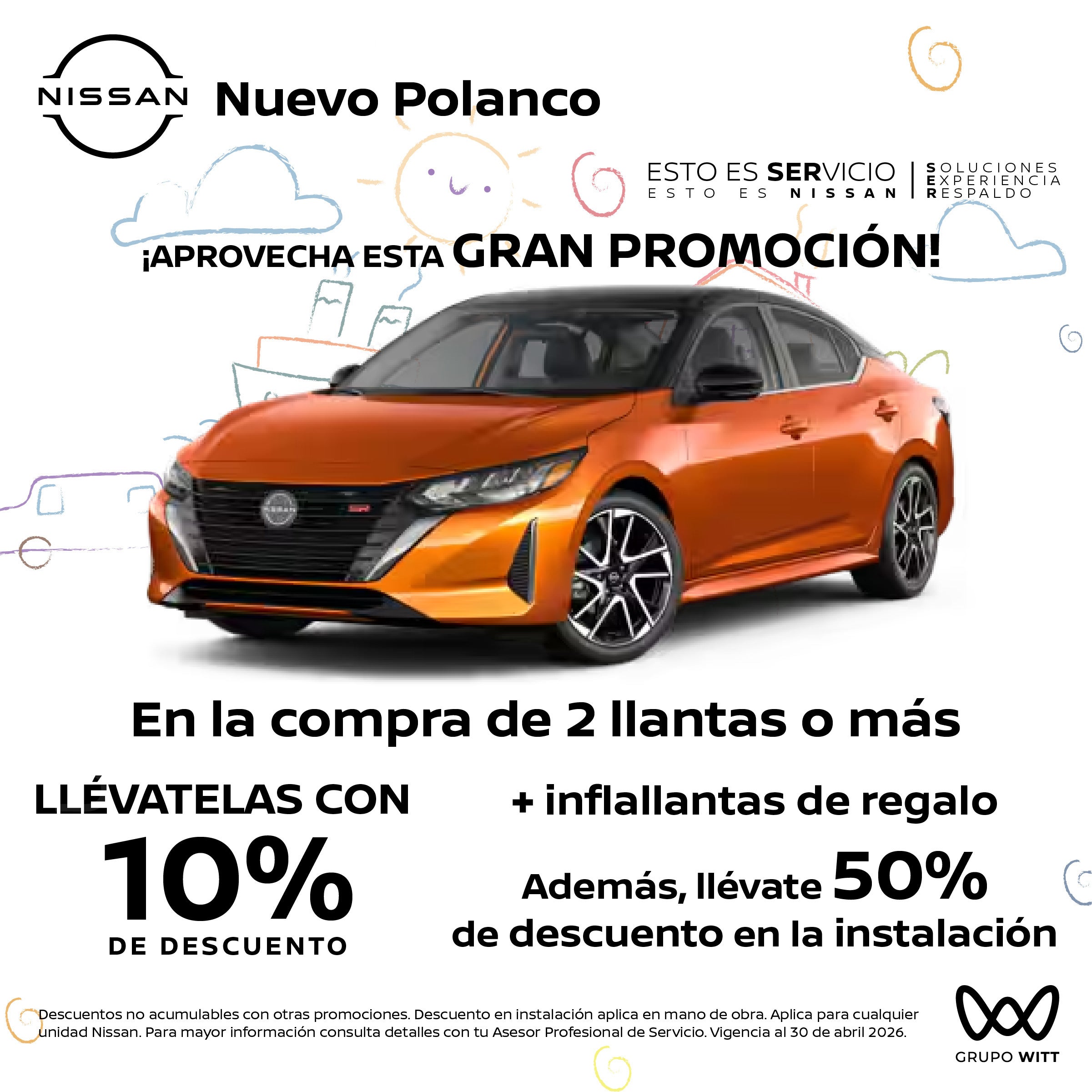 Descuentos no acumulables con otras promociones. Descuento en instalación aplica en mano de obra. Aplica para cualquier unidad Nissan. Para mayor información consulta detalles con tu Asesor Profesional de Servicio. Vigencia al 30 de abril 2026.
