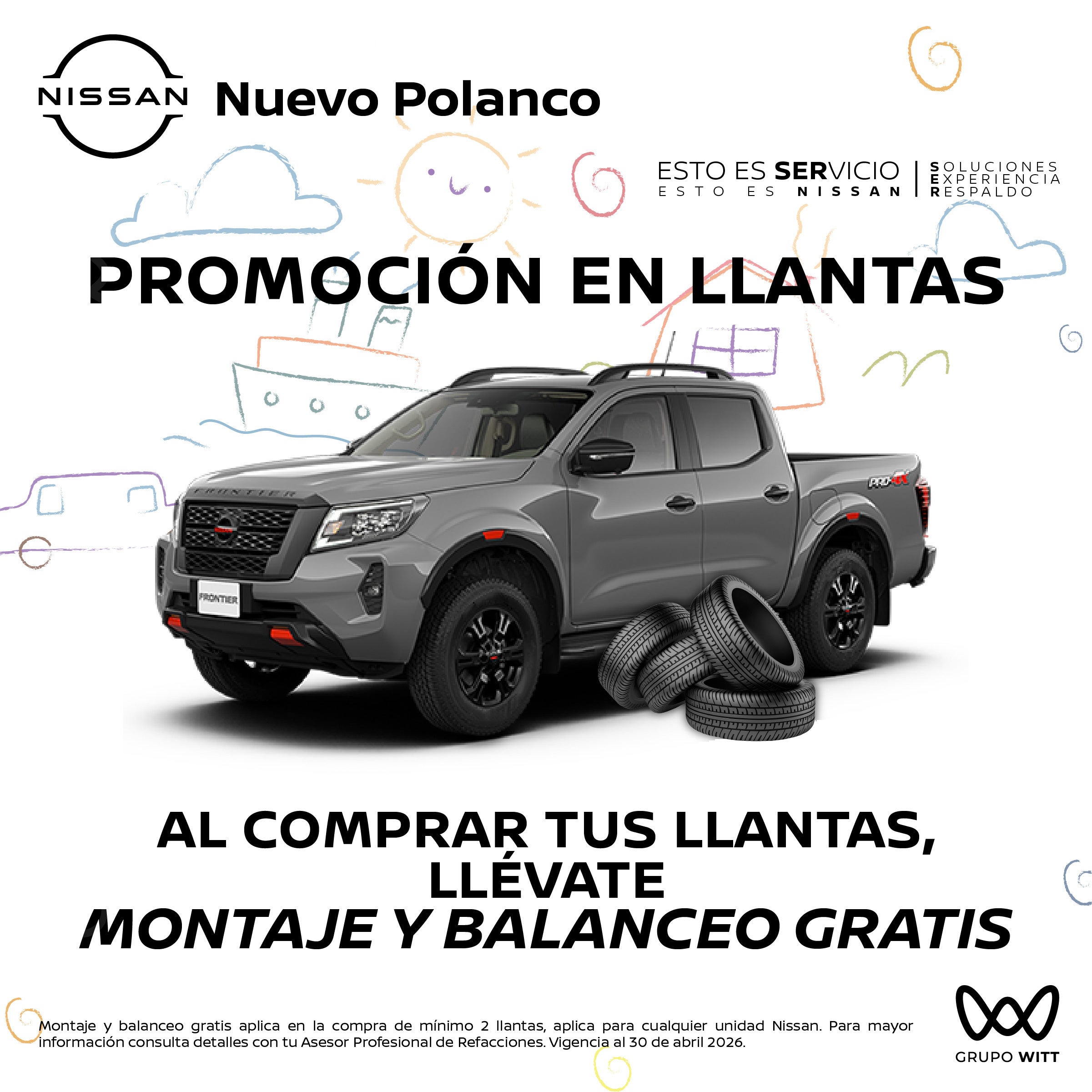 Montaje y balanceo gratis aplica en la compra de mínimo 2 llantas, aplica para cualquier unidad Nissan. Para mayor información consulta detalles con tu Asesor Profesional de Refacciones. Vigencia al 30 de abril 2026.