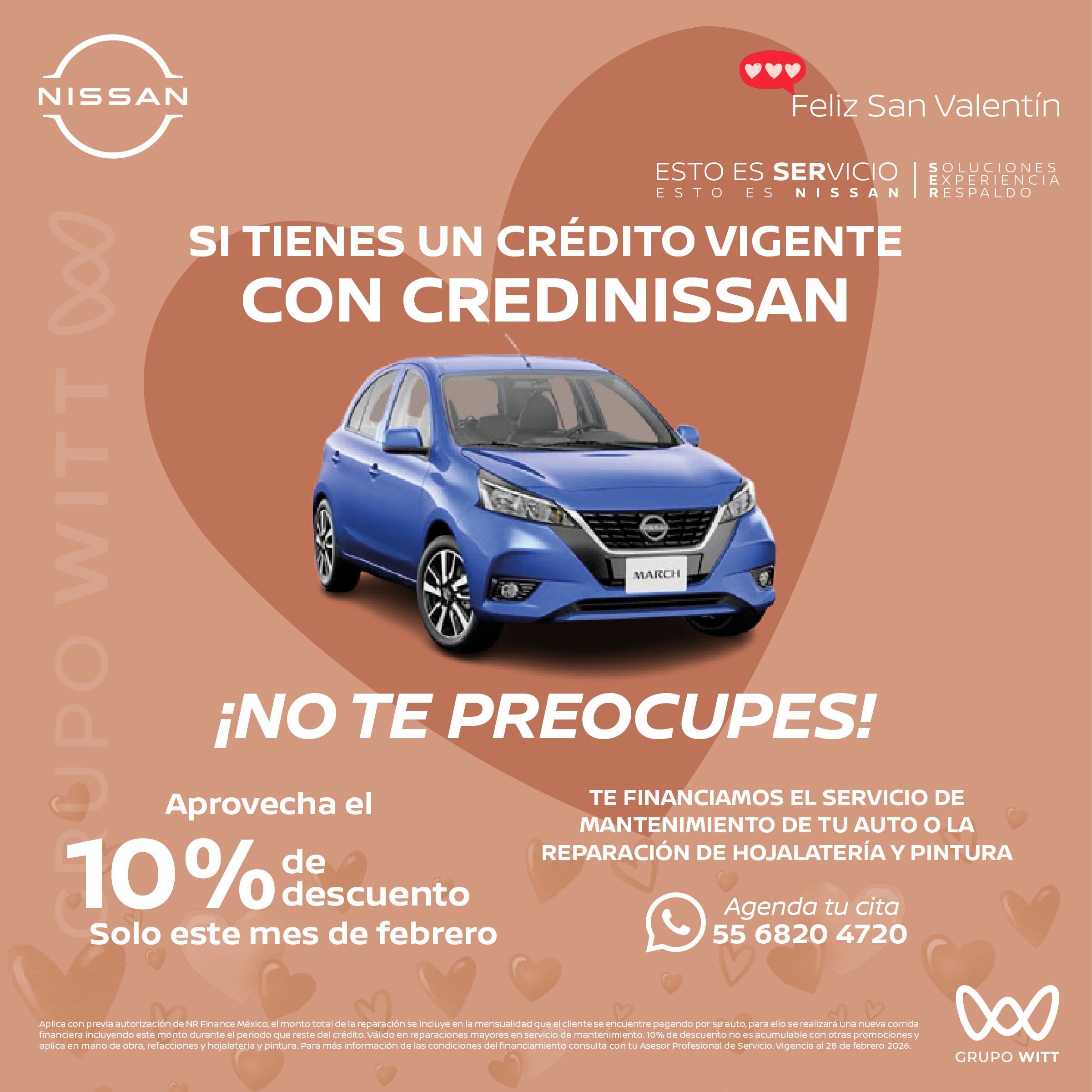 Aplica con previa autorización de NR Finance México, el monto total de la reparación se Incluye en la mensualidad que el cliente se encuentre pagando por su auto, para ello se realizará una nueva corrida financiera incluyendo este monto durante el periodo que reste del crédito. Válido en reparaciones mayores en servicio de mantenimiento. 10% de descuento no es acumulable con otras promociones y aplica en mano de obra, refacciones y hojalatería y pintura. Para más Información de las condiciones del financiamiento consulta con tu Asesor Profesional de Servicio. Vigencia a 28 de febrero 2026.