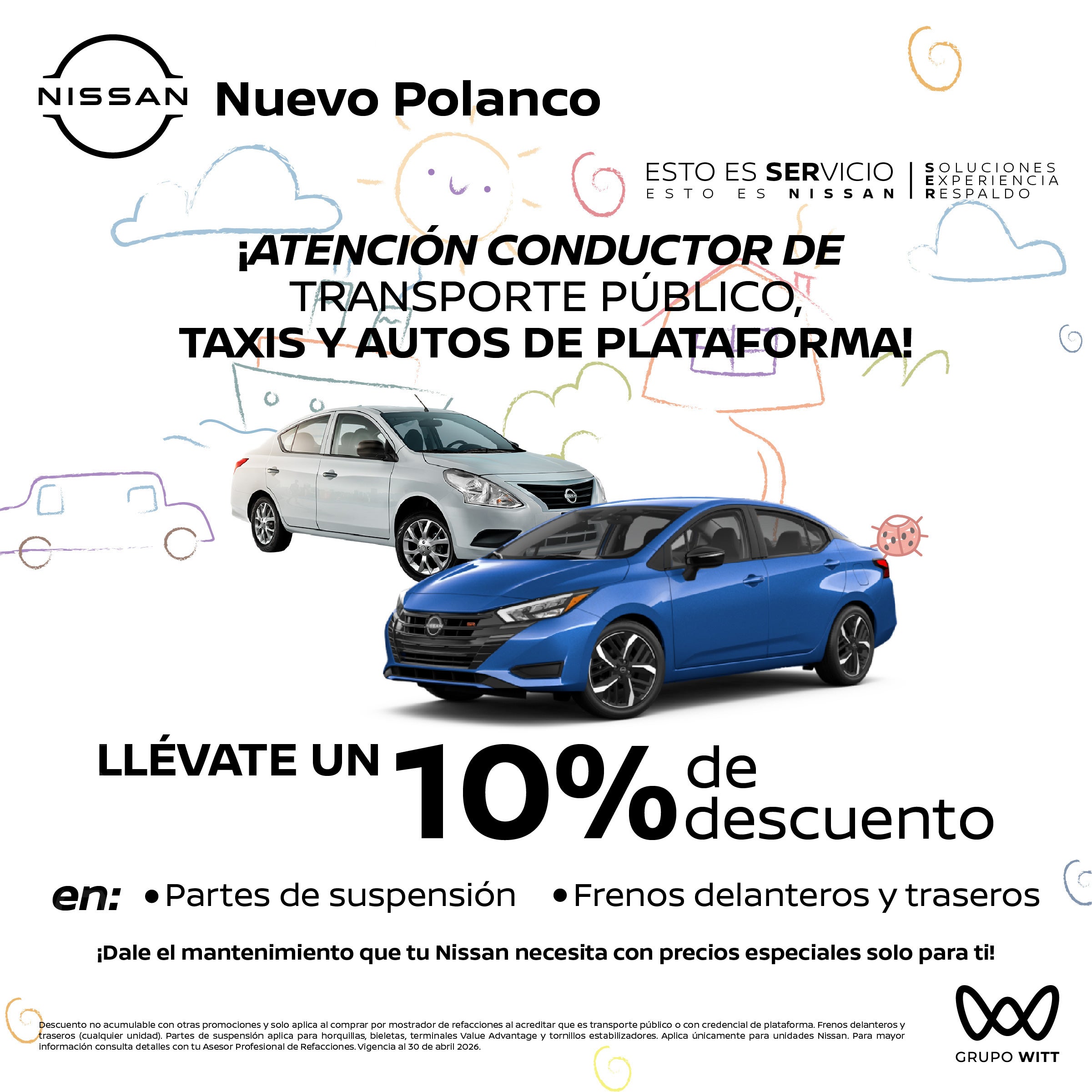 Descuento no acumulable con otras promociones y solo aplica al comprar por mostrador de refacciones al acreditar que es transporte público o con credencial de plataforma. Frenos delanteros y traseros (cualquier unidad). Partes de suspensión aplica para horquillas, bieletas, terminales Value Advantage y tornillos estabilizadores. Aplica únicamente para unidades Nissan. Para mayor información consulta detalles con tu Asesor Profesional de Refacciones. Vigencia al 30 de abril 2026.