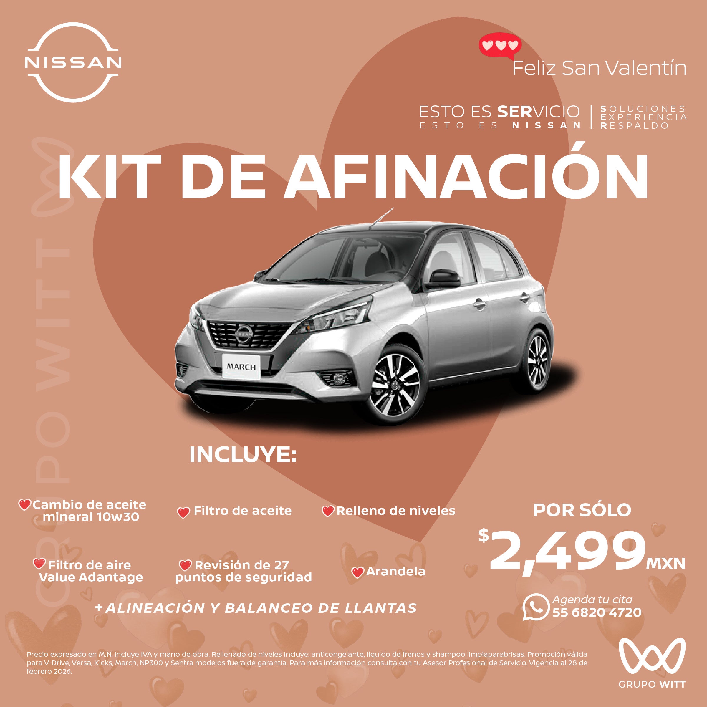 Precio expresado en M.N. incluye IVA y mano de obra. Rellenado de niveles incluye: anticongelante, líquido de frenos y shampoo limpiaparabrisas. Promoción válida para V-Drive, Versa, Kicks, March, NP300 y Sentra modelos fuera de garantia. Para más información consulta con tu Asesor Profesional de Servicio. Vigencia al 28 de febrero 2026.