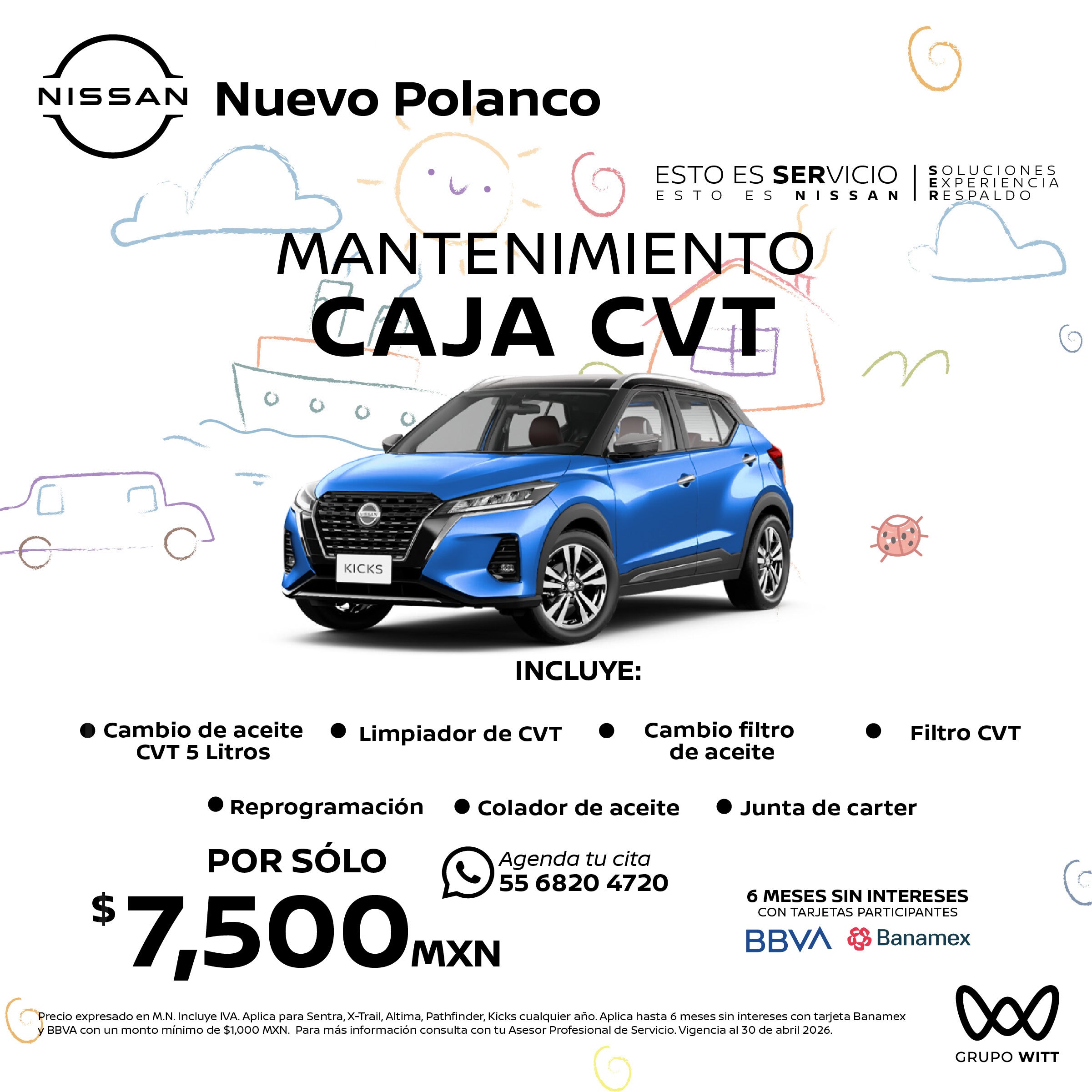Precio expresado en M.N. Incluye IVA. Aplica para Sentra, X-Trail, Altima, Pathfinder, Kicks cualquier ano. Aplica hasta 6 meses sin intereses con tarjeta Banamex y BBVA con un monto mínimo de $1,000 MXN. Para más información consulta con tu Asesor Profesional de Servicio. Vigencia al 30 de abril 2026.